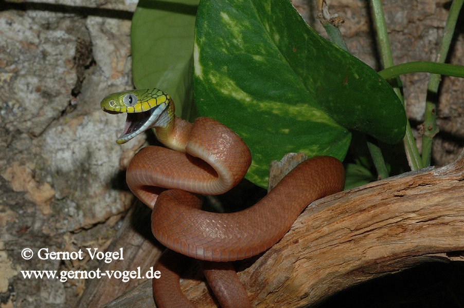 Její hlavní způsob sebeobrany je zastrašování široce rozevřenou tlamou s černými sliznicemi. Ačkoliv má zadní jedové zuby, její jed je mírný a pro člověka neškodný!